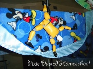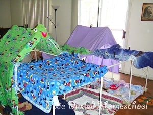Here it is with the blankets draped on. I think you can tell what side is the girls’ hut and which side is the boys’ hut. The quilt on the floor in the center was supposed to be the entry way, but quite often it ended up to be the cat’s pad.