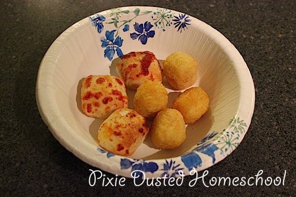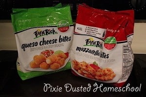 When the kids and I went to our local grocery store, we stared at the frozen section, trying to decide which two products to pick.  Soon, we picked the Queso Cheese Bites and the Mozzarella Bites and took them home.  We waited for a weekend evening when everyone was home to bake up these tasty treats to eat together.