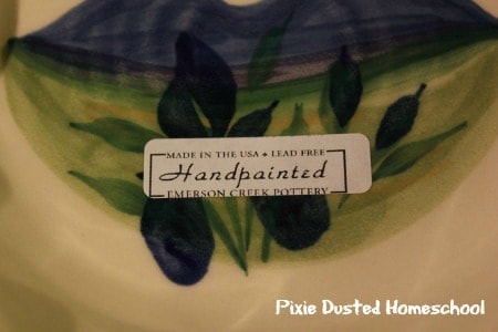 Emerson Creek Pottery is a U.S. company that still makes their pottery by hand in the U.S.  They make all sort of pottery from pet dishes to serving dishes to dinnerware.  You really have to read about Emerson Creek Pottery because their history is just so amazing!  Their pottery is handmade and hand-painted.