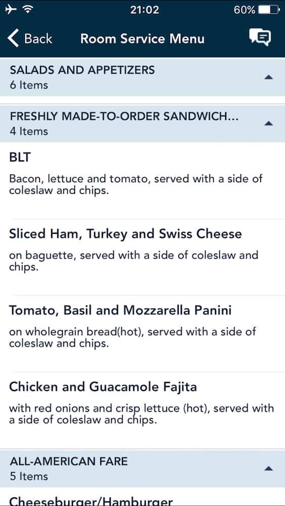 DCL Room Service Menu